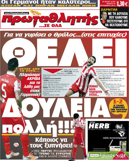 Πέμπτη, 20 Σεπτεμβρίου, 2012Κοιτάξτε λάθος στην πρώτη σελίδα ελληνικής εφημερίδας. Μπορεί να είναι αθλητική αλλά τόσο το χειρότερο γιατί τη διαβάζουν και οι μικροί. Άντε τώρα να γράψει ο πιτσιρίκος στην έκθεση την λέξη "πολύ" με αυτό τον τρόπο. Δεν έχουμε τίποτα με την εφημερίδα αλλά όχι κι έτσι! Μπορεί κι εμείς μερικές φορές να τα σκοτώνουμε αλλά εμείς ήρθαμε μικροί στην Αμερική