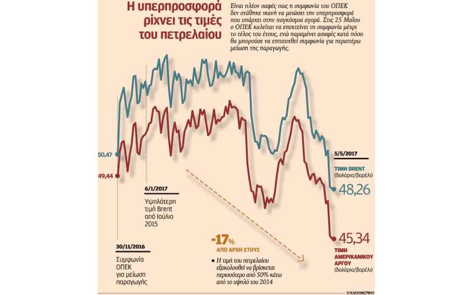 «Η αγορά έχει σταματήσει να πιστεύει ότι η μείωση της παραγωγής του ΟΠΕΚ θα εξαλείψει την υπερπροσφορά στην παγκόσμια αγορά», σχολιάζει στο Bloomberg ο κ. Μάικλ Πούλσεν, αναλυτής της Global Risk Management. Χθες, ο επικεφαλής της Σαουδικής Αραβίας στον ΟΠΕΚ δήλωσε ότι τόσο τα μέλη του καρτέλ όσο και άλλες χώρες συγκλίνουν προς την άποψη πως η μείωση της παραγωγής θα πρέπει να επεκταθεί και στο δεύτερο εξάμηνο του 2017. «Προκύπτει σύγκλιση απόψεων μεταξύ των κρατών πως υπάρχει η ανάγκη να επεκτείνουμε την συμφωνία που είχαμε κλείσει πέρυσι», δήλωσε στο Reuters o κ. Αντίμπ αλ Ααμα. Επιδίωξη του ΟΠΕΚ είναι να αποφασίσει, από κοινού με μη μέλη του οργανισμού, επέκταση της συμφωνίας για μείωση της παραγωγής στην επόμενη σύνοδο κορυφής του ΟΠΕΚ στις 25 Μαΐου στη Βιέννη. Ωστόσο, δεν υπάρχουν μεγάλες προσδοκίες, όπως, για παράδειγμα, συμφωνία για νέα μείωση της παραγωγής πετρελαίου, και το πιθανότερο είναι πως τα μέλη του ΟΠΕΚ και η Ρωσία θα συμφωνήσουν απλώς να επεκτείνουν τη συμφωνία μέχρι το τέλος του 2017. Ο υπουργός Πετρελαίου της Σαουδικής Αραβίας, Χαλίντ αλ Φατίχ, συνομίλησε τηλεφωνικά με τον Ρώσο ομόλογό του Αλεξάντερ Νόβακ την Πέμπτη και, σύμφωνα με το Ριάντ, η Μόσχα βλέπει θετικά το ενδεχόμενο επέκτασης της συμφωνίας. Και η τιμή των βιομηχανικών μετάλλων υποχωρούσε χθες, με την τιμή του σιδηρομεταλλεύματος να έχει υποχωρήσει κατά 12% από την αρχή της εβδομάδας.