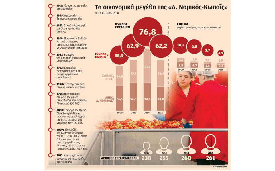Η «Δ. Νομικός Α.Ε.» ιδρύθηκε το 1915 στη Σαντορίνη, από τον Δημήτριο Νομικό, και ήταν η πρώτη εταιρεία παραγωγής προϊόντων ντομάτας στα Βαλκάνια, με εργοστάσια αρχικά στη Σαντορίνη, αργότερα στην Κω και από τη δεκαετία του 1970 επεκτάθηκε στην ηπειρωτική Ελλάδα. Σήμερα, 102 χρόνια μετά, η εταιρεία παραμένει 100% οικογενειακή και η τρίτη γενιά της οικογένειας, ο Δημήτρης, ο Μάριος και ο Πέτρος Νομικός, έχουν καταφέρει κόντρα στο γενικότερο κλίμα να την αναδείξουν στη μεγαλύτερη εταιρεία μεταποίησης ντομάτας στην Ελλάδα, με δυνατότητα επεξεργασίας που υπερβαίνει τους 300.000 τόνους νωπής ντομάτας τη σεζόν. Ο όμιλος ειδικεύεται στην παραγωγή προϊόντων ντομάτας –ντοματοπολτό, σάλτσα πίτσας, κύβοι ντομάτας κ.ά.– σε κατάλληλες συσκευασίες για βιομηχανικούς πελάτες ή μαζική εστίαση, ενώ συσκευάζει επίσης καταναλωτικά προϊόντα ντομάτας για μάρκες λιανικής και για ιδιωτικές ετικέτες σούπερ μάρκετ. Στην Ελλάδα από μερίδιο αγοράς περίπου 10% που είχε στα μέσα της δεκαετίας του 1990 σήμερα κυριαρχεί με μερίδιο αγοράς της τάξης του 60%. Στη μεγάλη διαδρομή της εταιρείας τα τελευταία χρόνια ξεχωρίζουν η εξαγορά το 2003 της Merko Gida SanayiVeTicaret, μία από τις μεγαλύτερες εταιρείες μεταποίησης ντομάτας στην Τουρκία, αποκτώντας έτσι βιομηχανική μονάδα και εκτός Ελλάδος, ενώ το 2007 εξαγόρασε την ελληνική θυγατρική της H.J. Heinz Ltd, την Copais S.A., κίνηση που κατέστησε τη «Δ. Νομικός - Κωπαΐς», μία από τις μεγαλύτερες ιδιωτικές εταιρείες μεταποίησης ντομάτας στην Ευρωπαϊκή Ενωση.