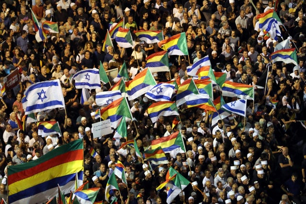 Κρατώντας σημαίες της κοινότητάς τους αλλά και ισραηλινές, οι διαδηλωτές πραγματοποίησαν πορεία στο κέντρο του Τελ Αβίβ φωνάζοντας «ισότητα».