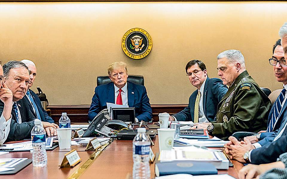 Ο πρόεδρος Τραμπ πήγε να τους συναντήσει μετά τη λήξη της σύντομης συνέντευξης Τύπου με τον κ. Μητσοτάκη. Στην αίθουσα βρίσκονταν ορισμένοι πολύ έμπειροι αξιωματούχοι εθνικής ασφαλείας, μαζί με τον αντιπρόεδρο Πενς και τον υπουργό Εξωτερικών Μάικ Πομπέο. Μέσω τηλεδιάσκεψης, τούς ενημέρωσε η Τζίνα Χάσπελ, διευθύντρια της CIA, η οποία παρακολουθούσε την εξέλιξη της κρίσης από το αρχηγείο της υπηρεσίας. Τις ημέρες πριν από τον θάνατο του Ιρανού στρατηγού Κασέμ Σουλεϊμανί, η Χάσπελ είχε ενημερώσει τον πρόεδρο των ΗΠΑ πως ο στρατηγός συνιστούσε μεγαλύτερη απειλή από ό,τι τα αντίποινα του Ιράν για τον θάνατό του.