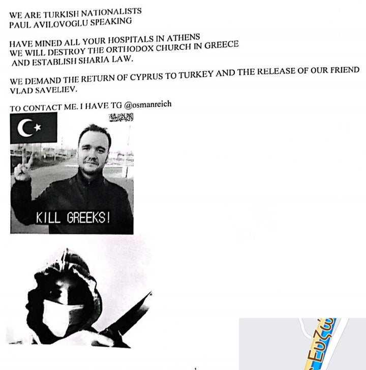 Ο συντάκτης του εμφανίζεται ως Paul Avilovoglu και δηλώνει εκπρόσωπος Τούρκων εθνικιστών. Τονίζει πως έχουν στο στόχαστρό τους όλα τα νοσοκομεία της Αθήνας, ότι θα καταστρέψουν την ορθόδοξη εκκλησία στην Ελλάδα και θα εγκαθιδρύσουν τη σαρία, ενώ ζητά την επιστροφή της Κύπρου στην Τουρκία και την απελευθέρωση του Vlad Saveliev, του 42χρονου Ρώσου μπλόγκερ που συνελήφθη την Τετάρτη.